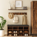 Incluye un perchero rústico, perfecto para colgar abrigos, bolsos, mochilas o accesorios, optimizando el espacio vertical y manteniendo todo en orden.
