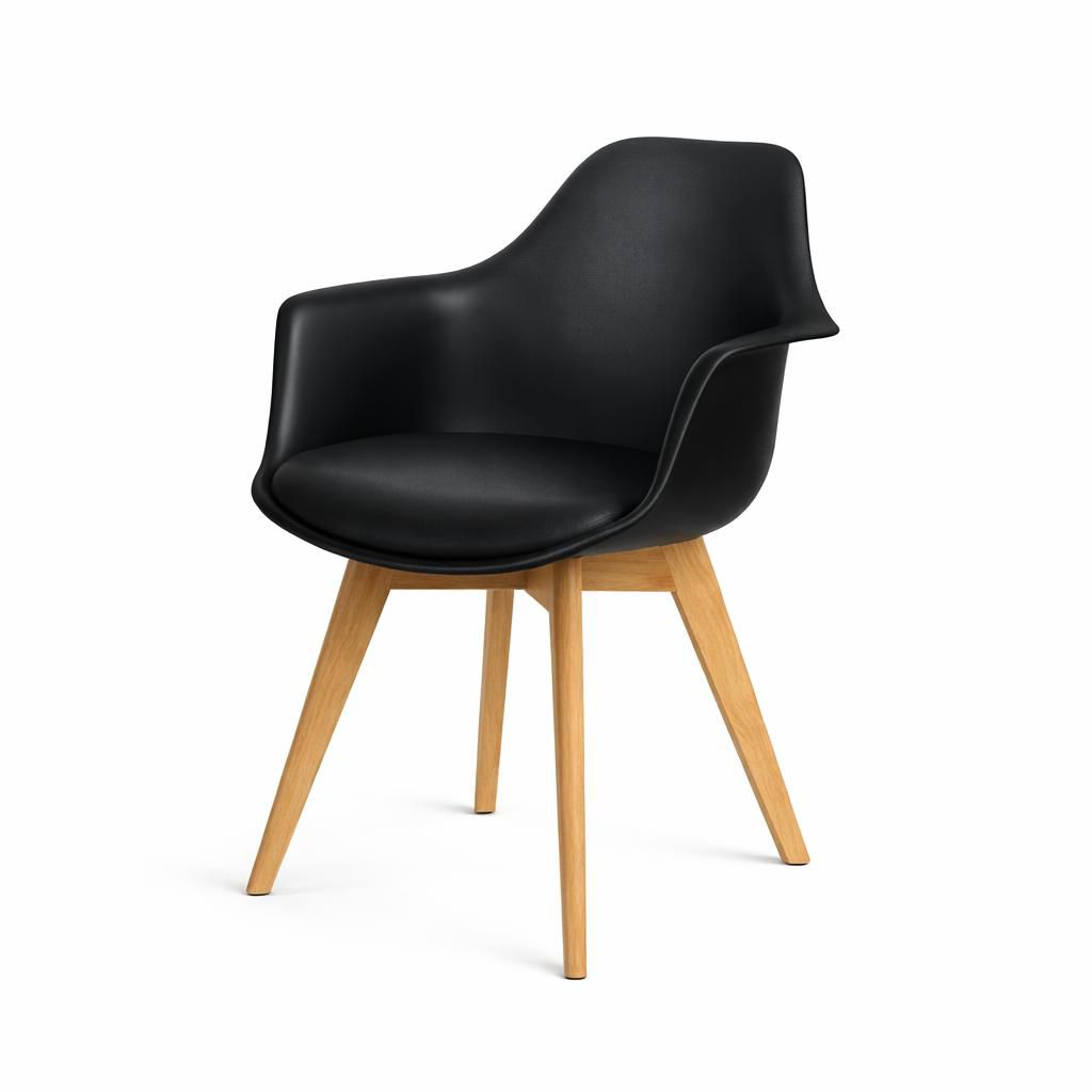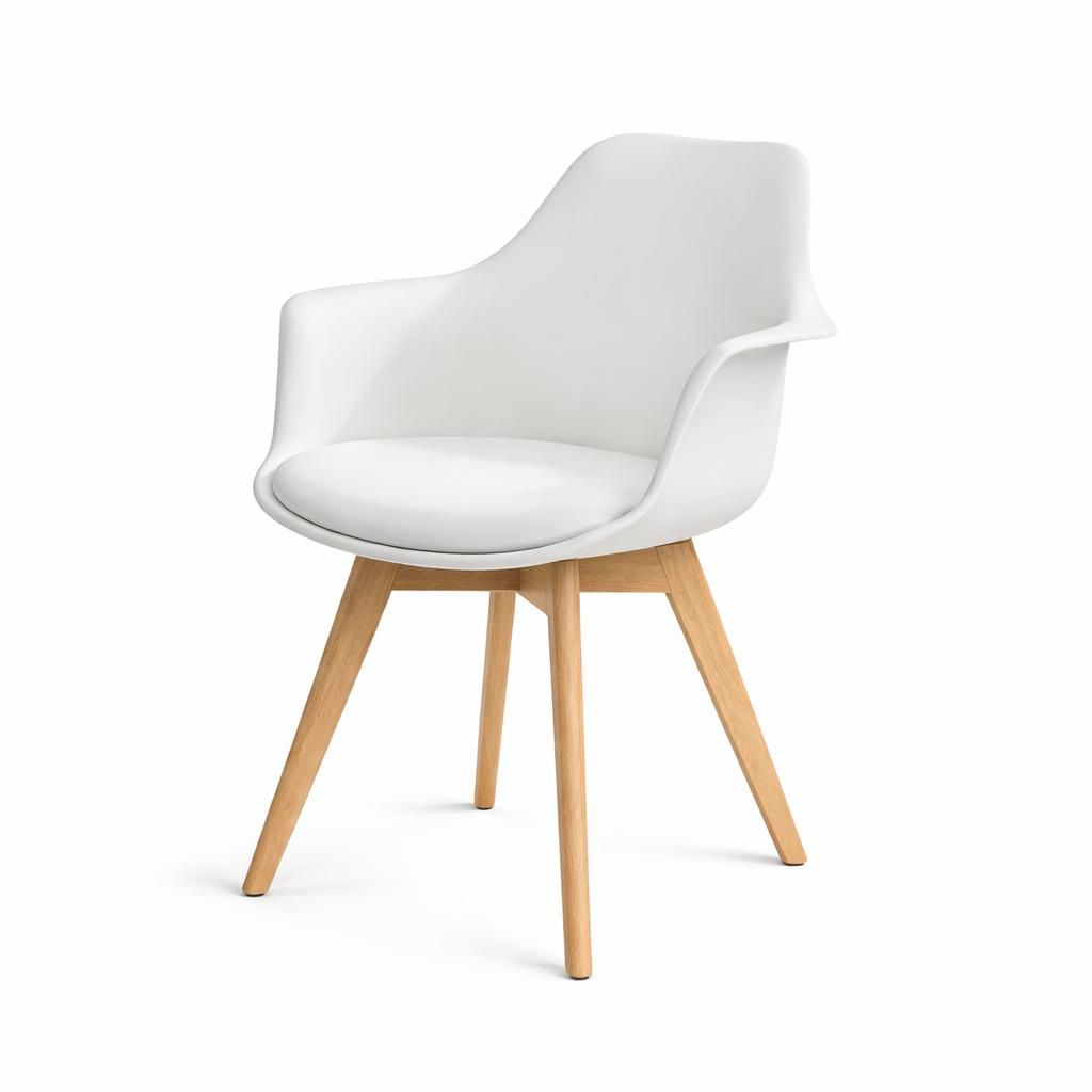 Su estructura envolvente con apoyabrazos integrados ofrece una postura ergonómica, ideal para comedor, escritorio o espacios de reunión. Las patas aportan firmeza y estabilidad, mientras su diseño versátil permite integrarla fácilmente en ambientes nórdicos, contemporáneos o industriales.