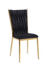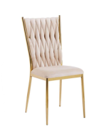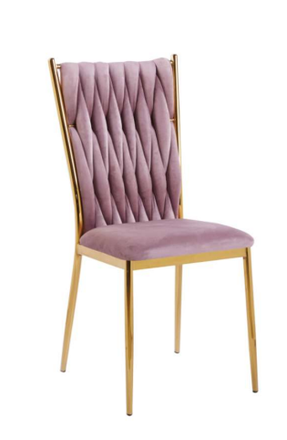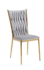 El respaldo cuenta con un armazón de metal tejido en felpa, que entrega firmeza, durabilidad y un diseño único que realza su estética. Sus patas de metal en color dorado aportan estabilidad y un acabado moderno y glamoroso, convirtiéndola en una pieza protagonista en cualquier ambiente.