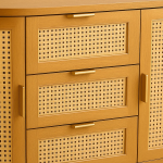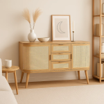 El Rack de TV Siena Rattan en tono natural combina diseño contemporáneo con detalles cálidos que aportan estilo y funcionalidad a tu espacio. Fabricado en MDF de alta calidad, incorpora elegantes frentes con rattan sintético que entregan textura y un look acogedor, ideal para living o sala de estar.