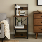 Fabricado en MDF de alta resistencia y una estructura de metal, ofrece estabilidad y durabilidad para el uso diario. Su diseño vertical permite un aprovechamiento eficiente del espacio, manteniendo todo organizado y al alcance. Además, incorpora un enchufe integrado, ideal para conectar lámparas, cargadores u otros dispositivos electrónicos, aportando mayor comodidad y practicidad.