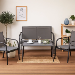 El Set Aero ofrece un diseño moderno y funcional, ideal para terrazas, patios o espacios exteriores e interiores contemporáneos. Este conjunto de 4 piezas combina una estructura de acero resistente con asientos y respaldos de textilene, material cómodo, respirable y de fácil mantenimiento.