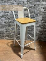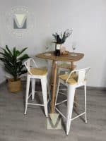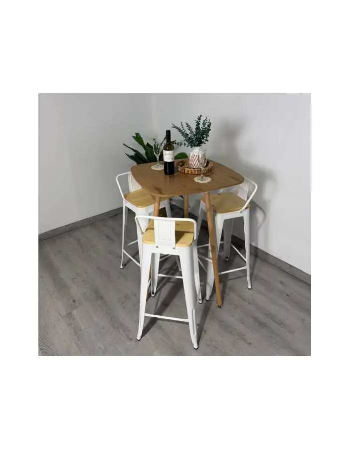 El set se completa con 3 taburetes Tolix de 75 cm, reconocidos por su diseño industrial atemporal. Su estructura metálica entrega resistencia y estabilidad, mientras que el asiento de madera clara suma calidez y comodidad, logrando un equilibrio perfecto entre estilo y funcionalidad.